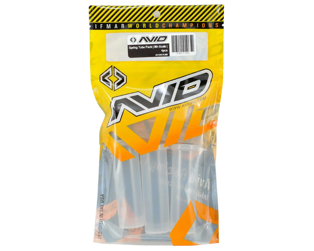 This is a pack of four Avid RC 1/8 Scale Spring Tubes. This 1/8 scale spring tube pack includes 4 clear plastic branded vials like those that already come in the Avid spring sets. Now you can get all your springs organized and kept safe so that wad of springs you have in the corner of your pit box can finally find a home.