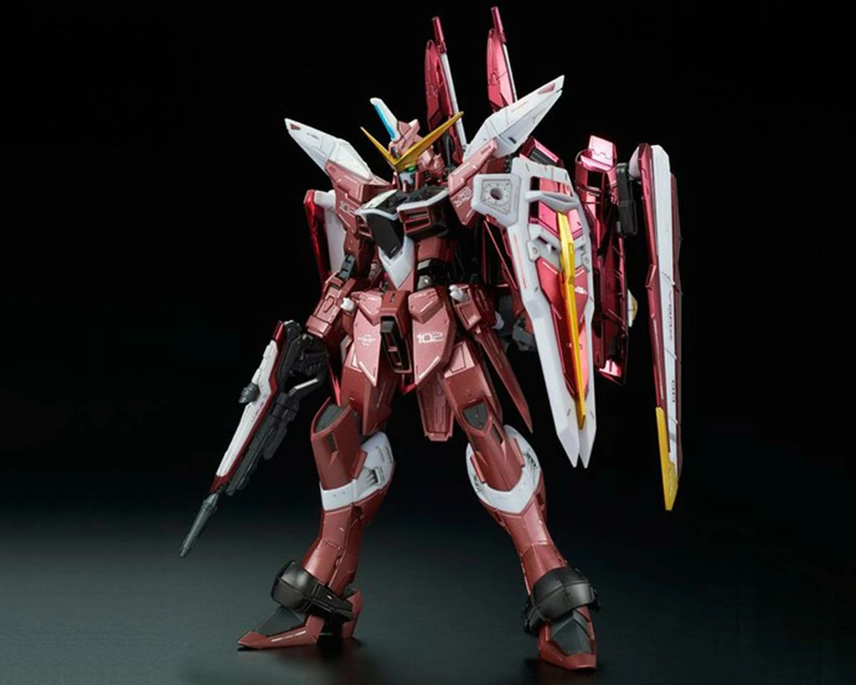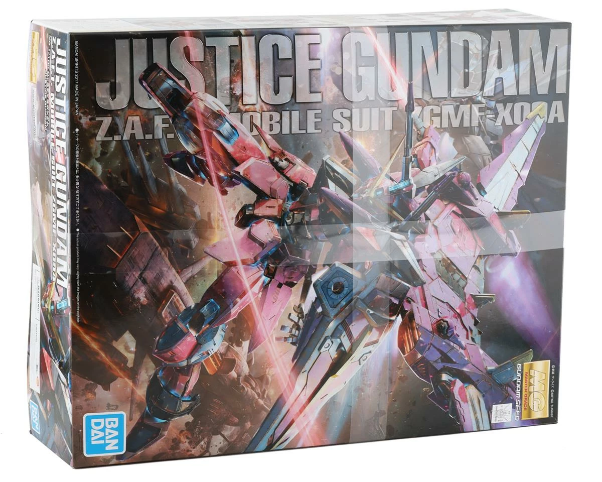 Bandai Justice Gundam “Gundam SEED” MG ZGMF-X09A Model Set. This model features extreme detail and features the beam rifle, shield, dual beam sabers, interchangeable hands for posing options, and a fully-functional Fatum Unit that can be displayed in various positions. Package includes one model kit.