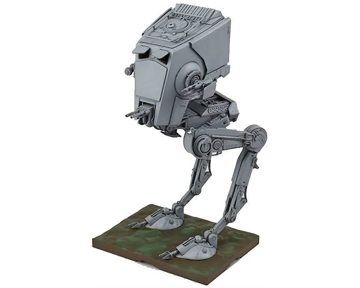 This is a Bandai Star Wars 1/48 AT-ST Walker from the Star Wars universe, affectionately known as a “Chicken walker”. The model is a snap-together setup, requiring no paint or glue to complete. This iconic model has been faithfully recreated in 1/48 scale with multiple interactive features such as highly detailed articulated legs, rotating head and weapon systems, two 1/48 seated figures, movable view ports for cockpit, opening top hatch. This kit includes a terrarium themed base to display the finished model.