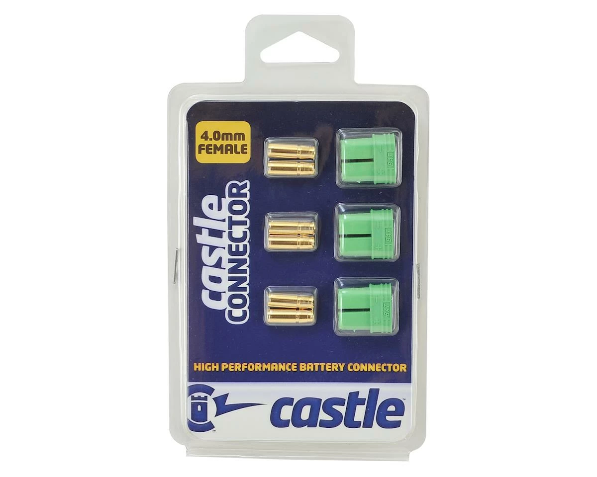 The Castle Creations 4mm Polarized Bullet Connector Set is a high current, polarized connector system developed specifically for high demand electric RC applications. The Castle system combines the low resistance qualities of a bullet connector, with the convenience of a molded plastic plug that eliminates the risk of reversing the polarity and blowing up your system! These are ideal for batteries, ESCs, charger leads, parallel and series harnesses, high current amp/watt meters, and anything else that needs extremely high current – regardless of the brand.