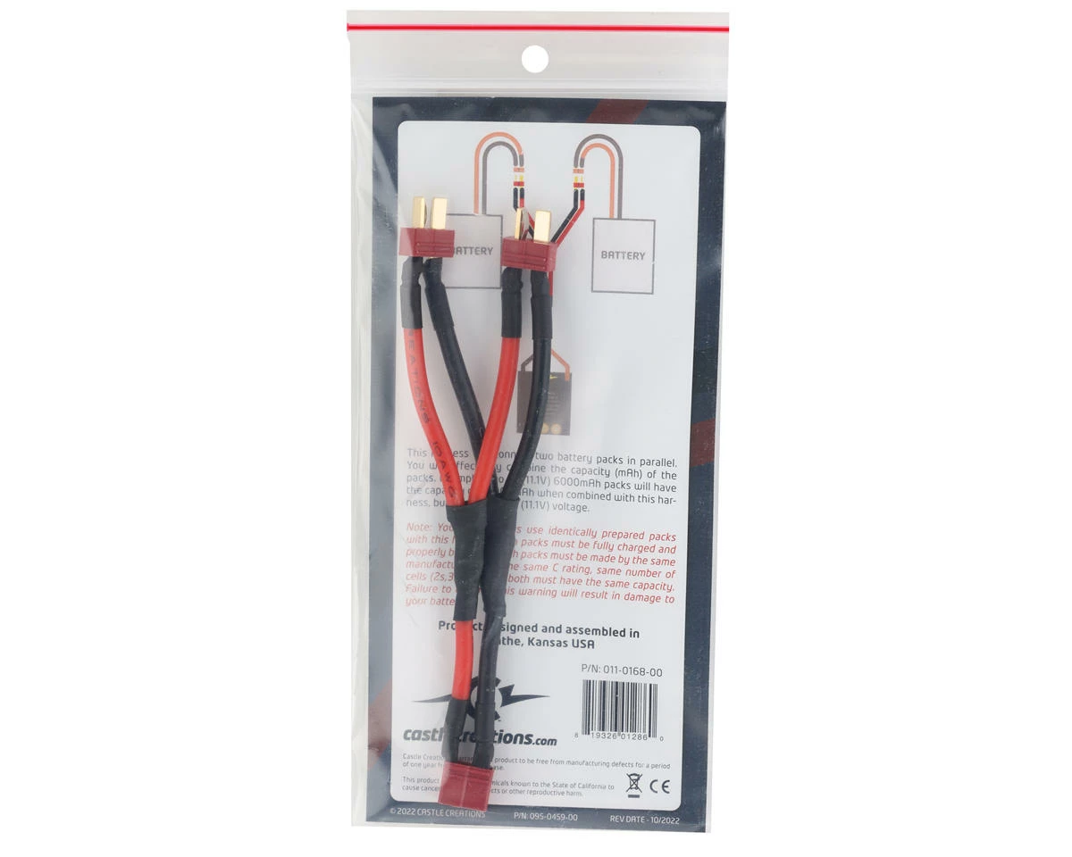 The Castle Creations T-Plug Parallel Wire Harness allows you to connect two battery packs in parallel, combining the capacity of your battery packs. For example: two 3s (11.1V) 6000mAh packs will have the capacity of 12,000mAh when combined with this harness, but remain at 3s (11.1V) voltage.