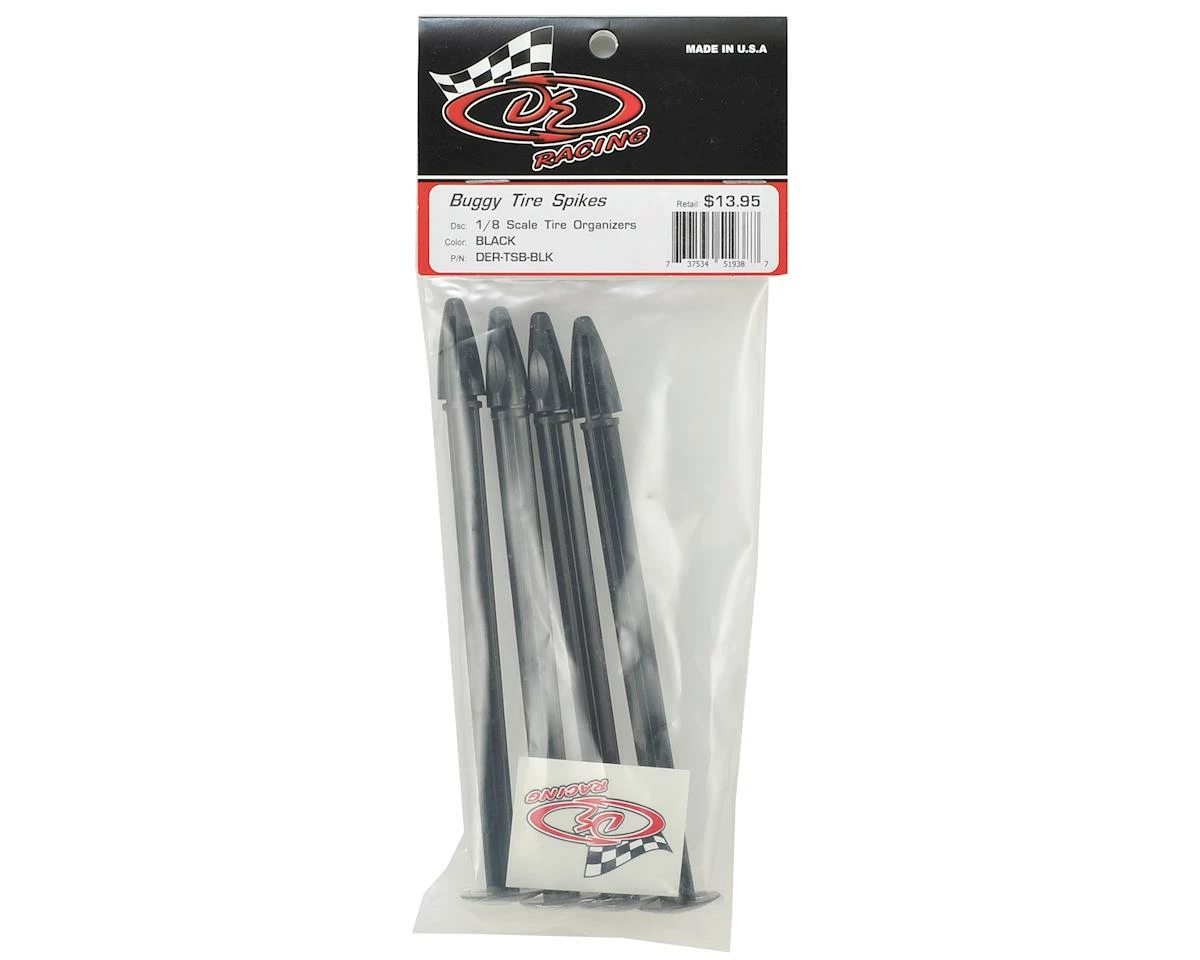 This is a set of four DE Racing 1/8 Buggy Tire Spikes. This quick and simple to use tool allows you to organize and ID your tires by tread and compound. No more fumbling or guesswork regarding tire sets, lost tires, or extra hardware. You’ll wonder how you ever raced without them.