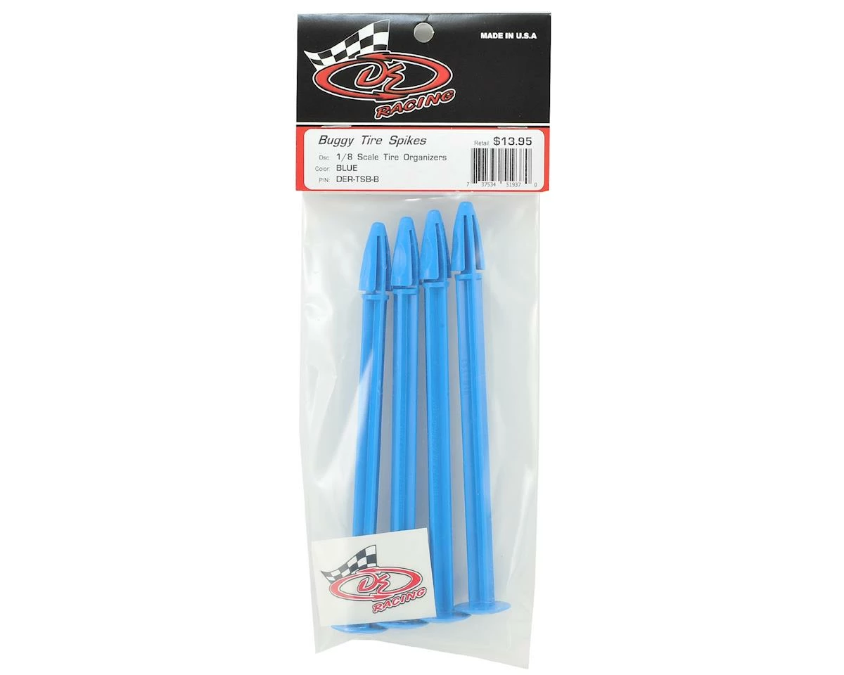 This is a set of four DE Racing 1/8 Buggy Tire Spikes. This quick and simple to use tool allows you to organize and ID your tires by tread and compound. No more fumbling or guesswork regarding tire sets, lost tires, or extra hardware. You’ll wonder how you ever raced without them.