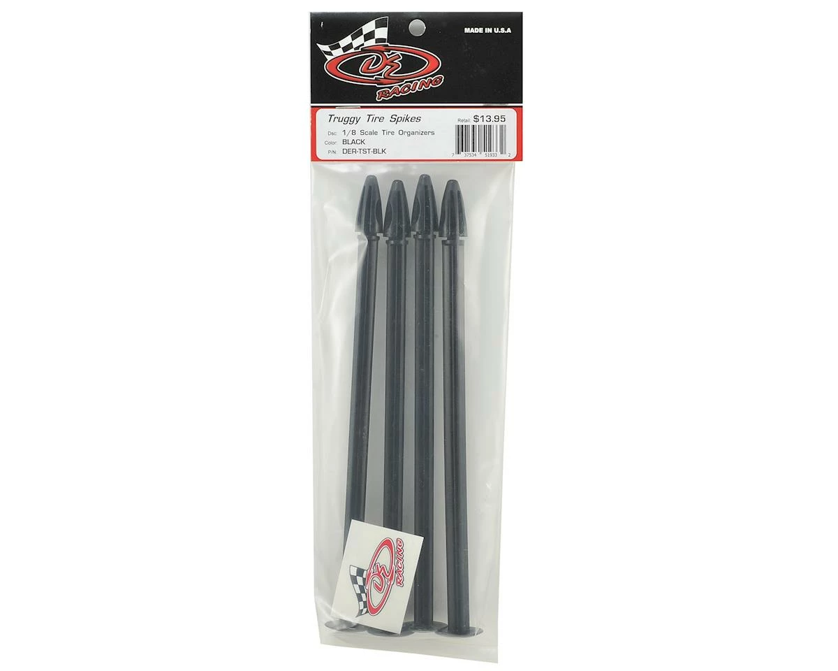 This is a set of four DE Racing Truggy Tire Spikes. This quick and simple to use tool allows you to organize and ID your tires by tread and compound. No more fumbling or guesswork regarding tire sets, lost tires, or extra hardware. You’ll wonder how you ever raced without them.