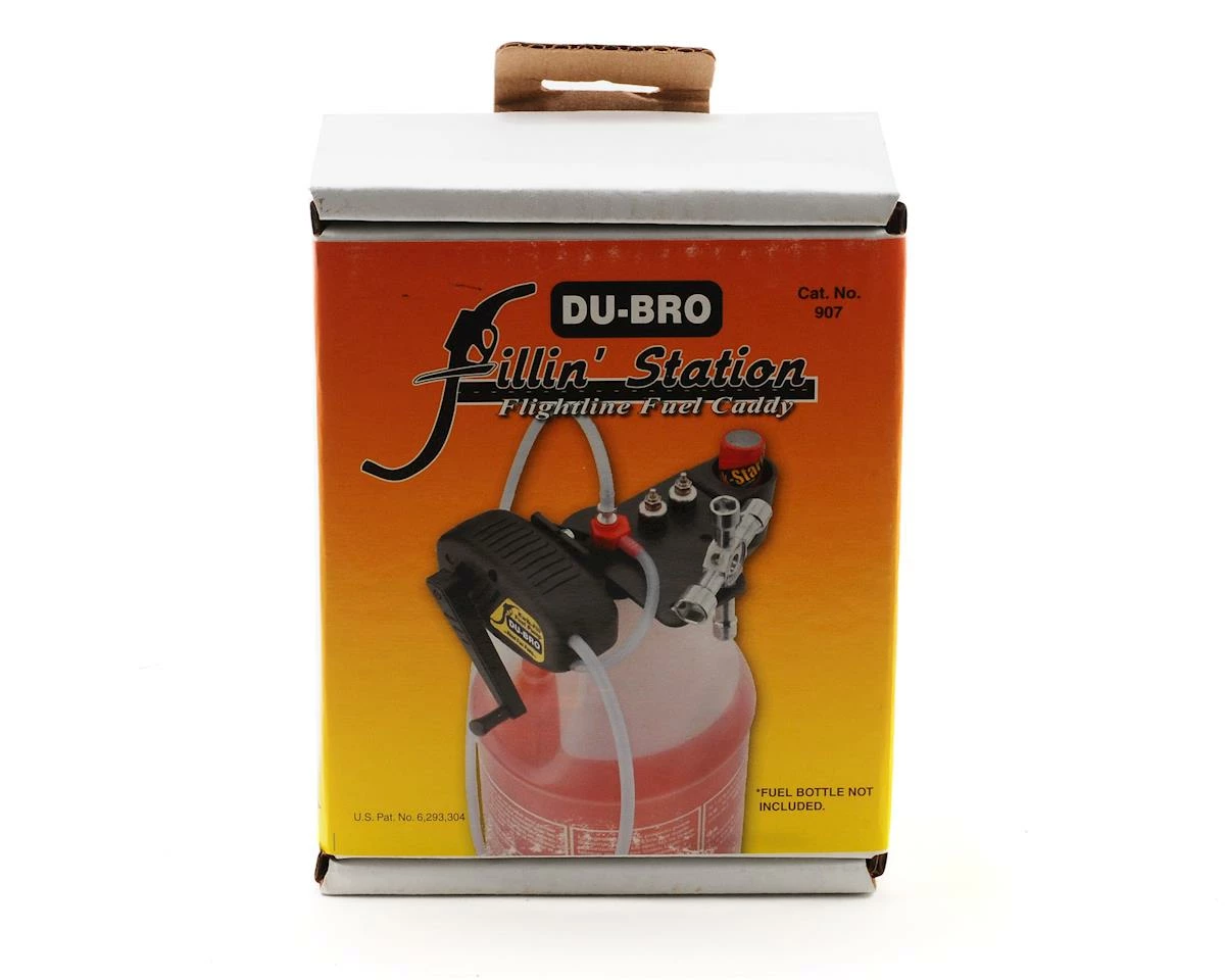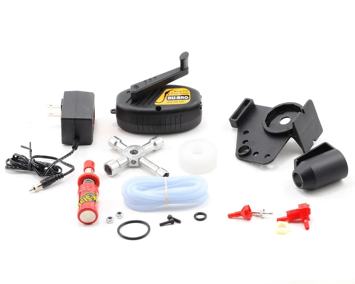 This is the Du-Bro Fillin’ Station Complete Fuel Caddy. When you fuel your aircraft with the Fillin’ Station from DU-BRO, you will have everything you need right on board your bottle. The Fillin’ Station comes complete with the Du-Bro Kwik-Fill Hand Crank Fuel Pump, Kwik Fill Fuel Cap Fitting, Leak Proof Cap, Silicone Tubing, Built-In Tool Holders, Anodized Glo Plug Holders, Kwik Start Glo-Plug Ignitor with charger, Glo Caddy, and the Du-Bro 4-Way Wrench.