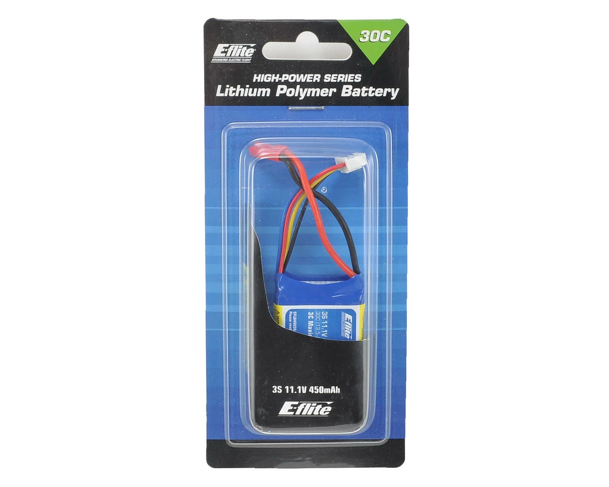 This is an E-flite 3S, 30C, 450mAh Li-Poly Battery Pack, with a JST connector. E-flite High-Power Series Lithium Polymer Batteries offer an excellent blend of weight, power and performance. Available in a wide variety of capacities and voltages, there’s a battery perfect for almost any application, from indoor slow flyer to large-scale sport and aerobatic airplane models as well as micro to mid-sized helicopter models.