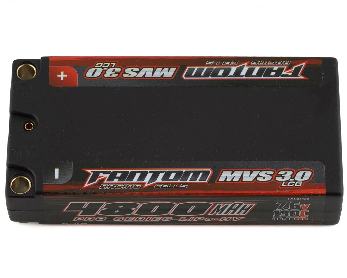Fantom Pro HV MVS 3.0 LCG Shorty 2S LiPo 130C Battery with 5mm Bullets. Package includes one battery, two 5mm bullets, one 2mm bullet and one deans charge lead.