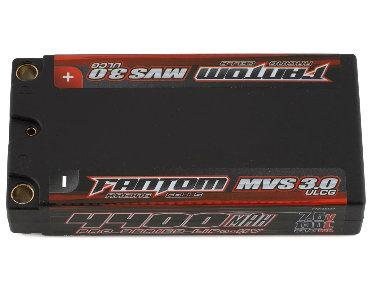 Fantom Pro HV MVS 3.0 ULCG Shorty 2S LiPo 130C Battery with 5mm Bullets. Package includes one battery, two 5mm bullets, one 2mm bullet and one deans charge lead.