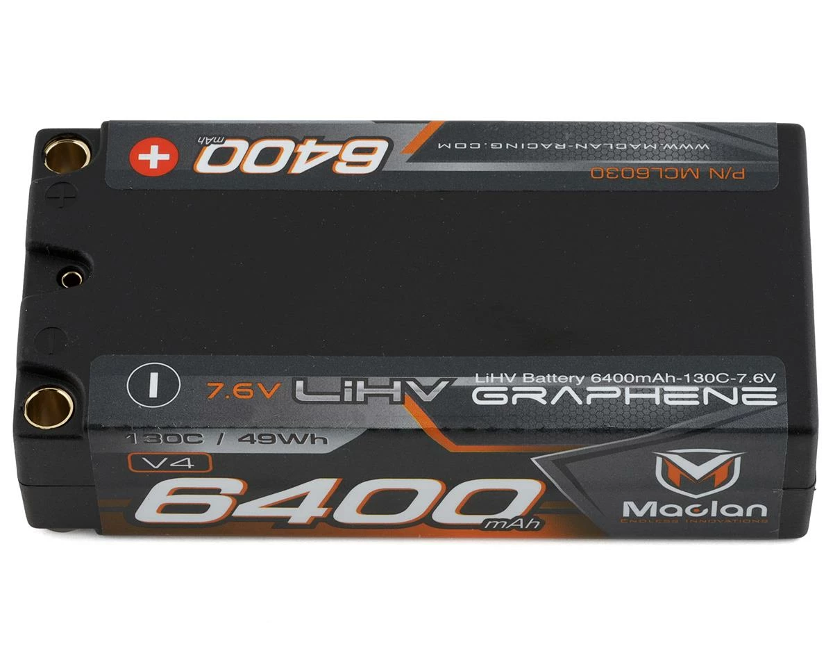 Maclan Racing HV Graphene V4 2S – 6400mAh Shorty LiPo Batteries feature the latest 2022 chemistry. These batteries have evolved with the latest technology to improve capacity/weight ratio along with lower IR for better discharge performance. Available in a variety of configurations with both shorty and stick sizes for different application needs. There are also standard, LCG, and ULCG thickness options to help adjust CG to provide more performance options for extreme racers.