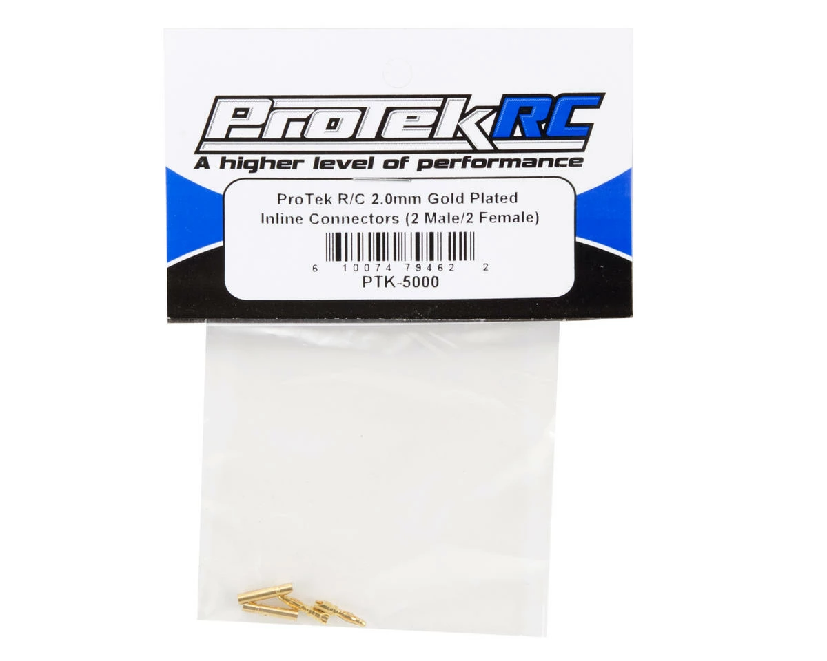 This is a pack of two pairs of 2.0mm diameter gold plated inline connectors from ProTek R/C. There are total of two female and two male connectors in the package.