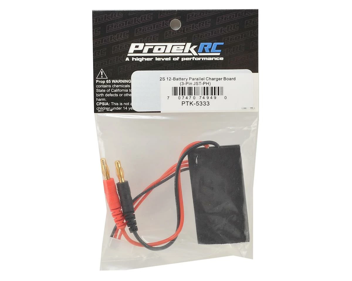 This is the ProTek R/C 2S 12-Battery Parallel Charger Board. Do you have a lot of micro flight batteries to charge? The ProTek R/C Parallel Charge Board will charge up to twelve 2S LiPo flight batteries with 3-Pin JST-PH connectors simultaneously, and also balance the individual cells of each battery during the charge process. The 3-pin JST-PH type of connector is found on many of the E-flite UMX airplanes and Blade 130X helicopter. Â