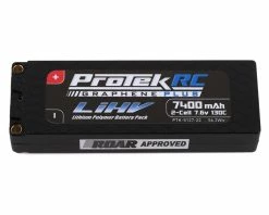The ProTek R/C 2S 130C Graphene + HV 7400mAh LiPo Battery is the perfect battery option for anyone looking for a lightweight and high capacity LiPo battery. Weighing only 324 grams, this 2S pack is lighter than a standard 2S pack, with much higher capacity. These advancements lead to increase in both voltage and punch throughout a run.