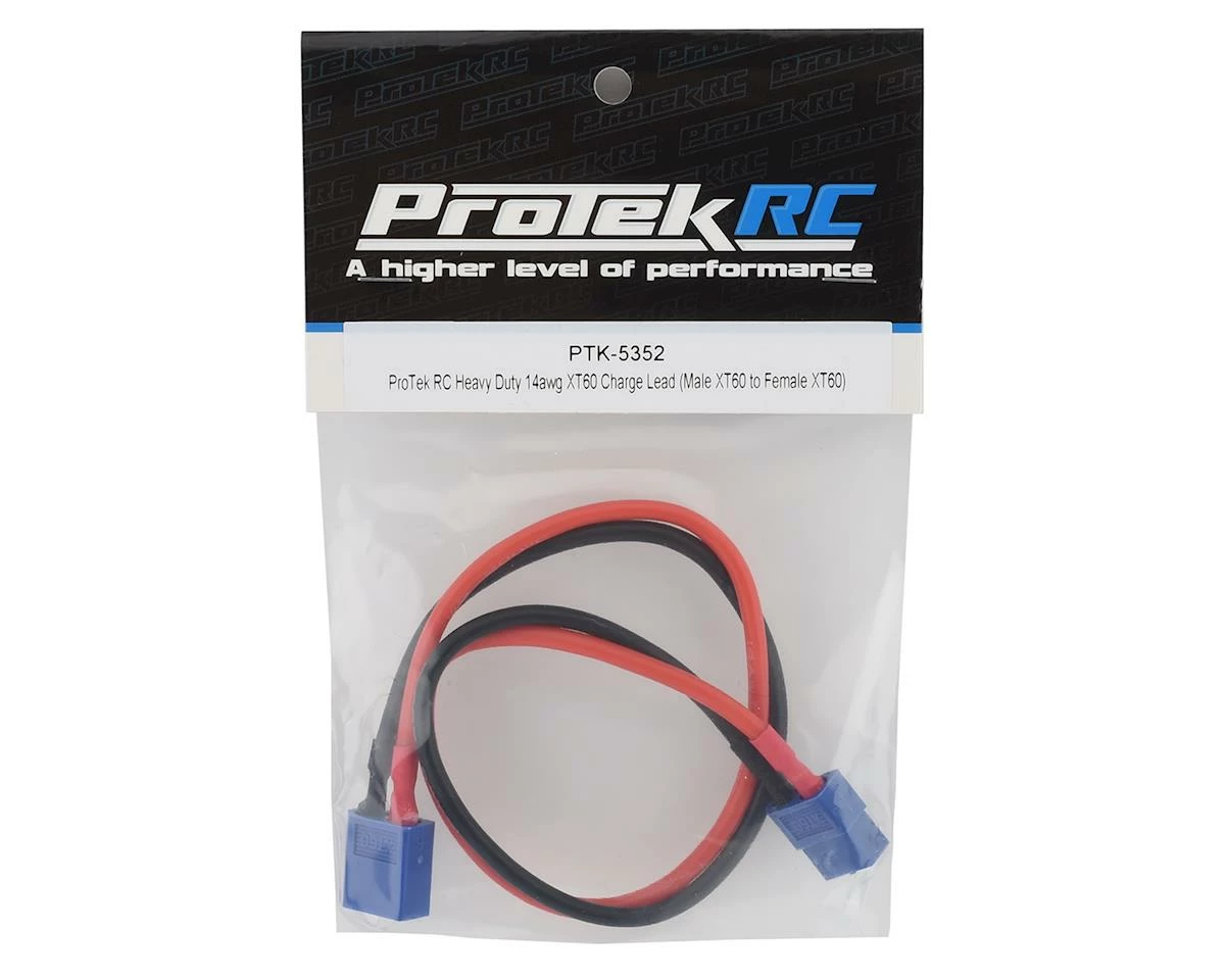 The ProTek R/C Heavy Duty 14awg XT60 Charge Lead is perfect for modern chargers that use an XT60 input to connect the charge lead. The 12 inch long 14awg wire allows high amp rate charging and can handle charge rates more than 20 amps.Â