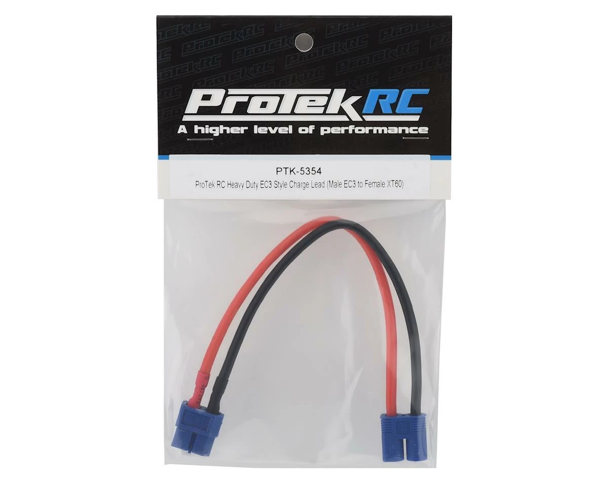 The ProTek R/C Heavy Duty EC3 Charge Lead Adapter features a “male” EC3 with male bullets, connected to a female XT60. Thanks to the 6 inch long 14awg wire, this adapter can be used for heavy duty charging and can handle charge rates more than 20 amps. This adapter can also be used for ESC to battery connections, allowing you to connect your EC3 plug equipped battery to an ESC with an XT60.Â