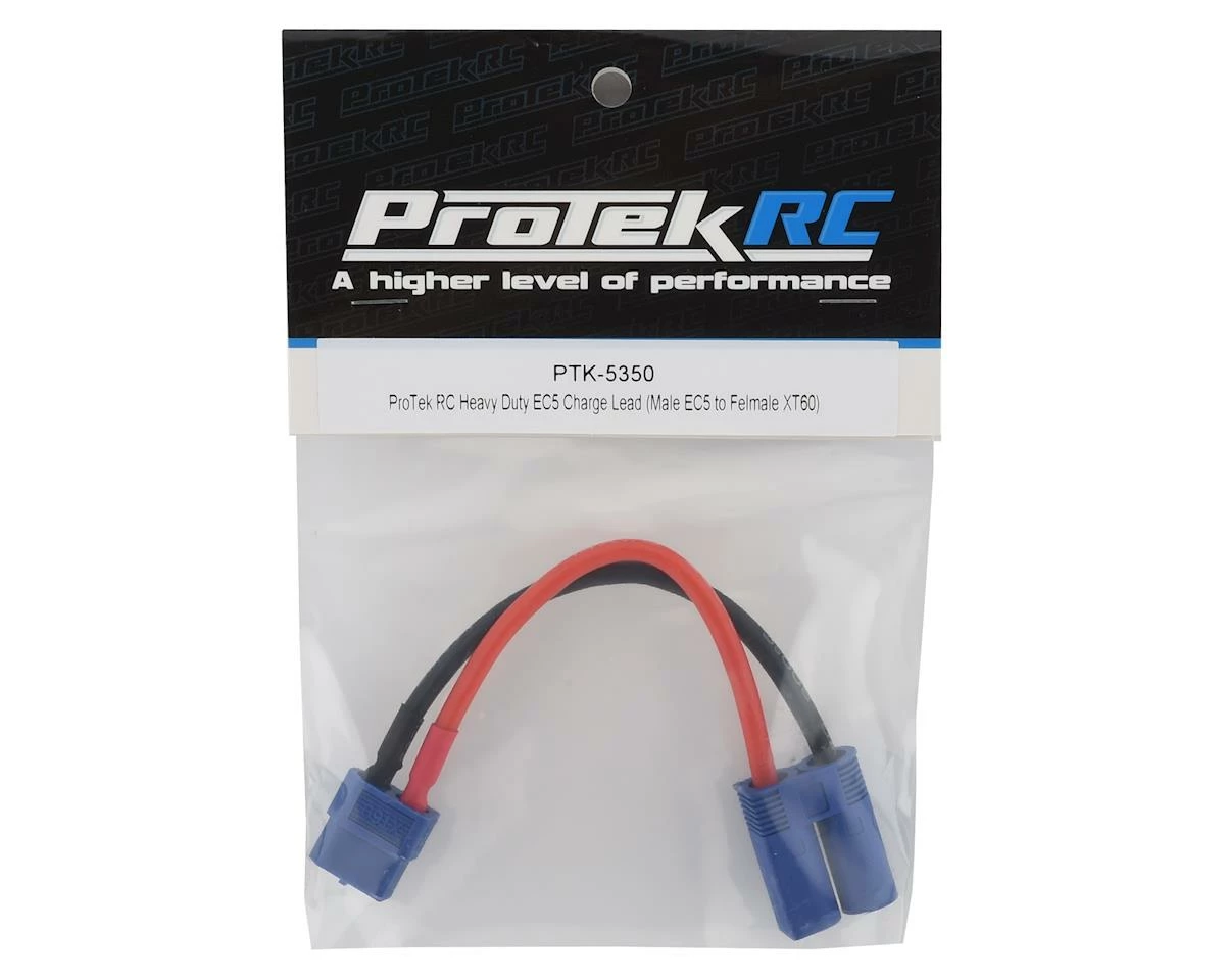 The ProTek R/C Heavy Duty EC5 Charge Lead Adapter features a “male” EC5 connector with male bullets, connected to a female XT60. Thanks to the 4 inch long 14awg wire, this adapter can be used for heavy duty charging and can handle charge rates more than 20 amps. This adapter can also be used for ESC to battery connections in some applications, allowing you to connect your EC5 equipped battery to an ESC with an XT60.