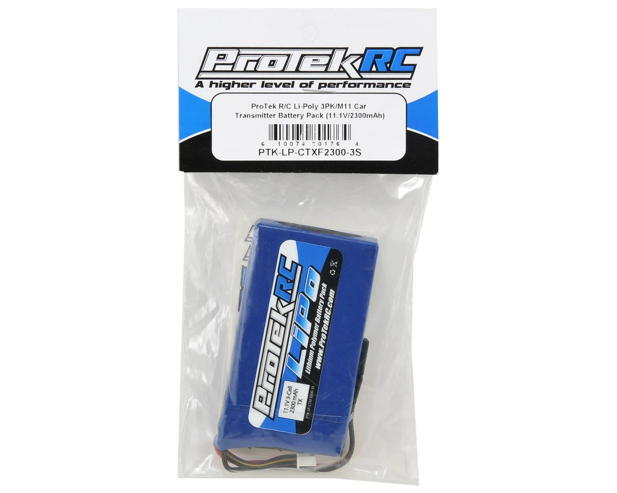 This is a Li-Poly 2300mAh transmitter battery pack from ProTek R/C that fits the Futaba 3PK and Airtronics M11 transmitters. This light weight Li-Poly transmitter battery is designed to reduce the overall weight of your transmitter, which is great for those long main events! The overall weight of your transmitter will be significantly reduced over the use of typical NiMh transmitter packs. (138 grams compared to 225 grams for eight typical NiMH AA batteries!). Try to hold a pack of eight traditional AA size batteries and compare it with this Li-Poly Transmitter pack. The feeling is just awesome, and you get an incredible 7 to 8 hours of run time!