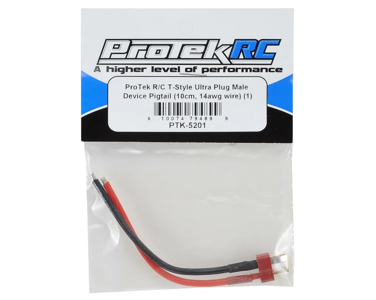 This is a male T-style ultra plug pigtail from ProTek R/C. The ultra plug is connected to 10cm of 14awg silicone wire.