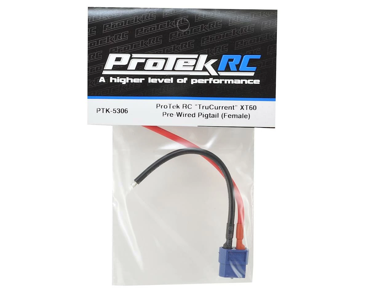 This is a “TruCurrent” XT60 Pre-Wired Pigtail, with a pre-installed female XT60 connector from ProTek R/C. ProTek R/C “TruCurrent” XT60 connectors ensure a mechanically solid, low resistance, high-amp capacity connection and are the ideal power connector for high current applications. The “TruCurrent” XT60 plug is connected to 10cm of 14awg silicone wire.