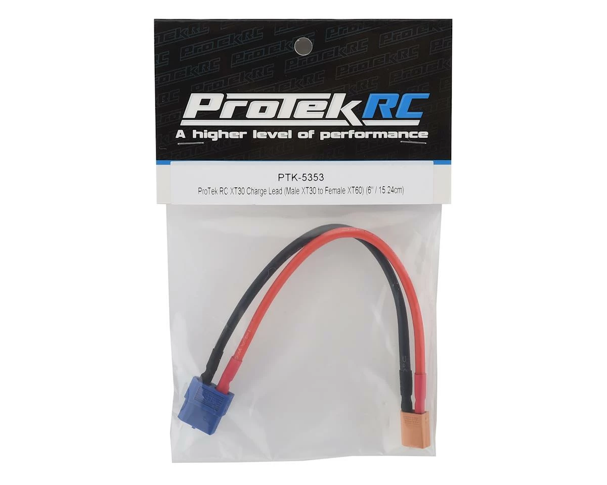 The ProTek R/C Heavy Duty XT30 Charge Lead Adapter features a “male” XT30, connected to a female XT60. Thanks to the 6 inch long 14awg wire, this adapter can be used for heavy duty charging and can handle charge rates more than 20 amps. This adapter can also be used for ESC to battery connections in some applications, allowing you to connect your XT30 equipped battery to an ESC with an XT60.Â