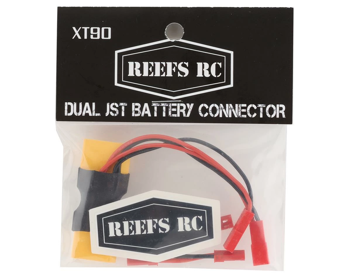 Reefs XT90 Dual JST Pass Through with 2 Male-Male JST Adaptors. This optional pass through allows you to power two devices that require a JST connector, while not interfering with the main battery connection. Two male-to-male adapters are included for added versatility. Package includes one pass through adapter and two JST adapters.