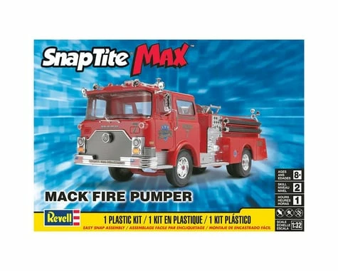 This is a Revell Germany Snap Tite 1/32 Mack Fire Pumper, an easy assembly, snap together plastic model kit that will bring a small scale Fire Pumper to life. The highly detailed pieces are molded in clear and red for a bright finished product.