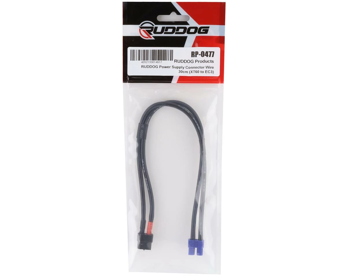 Ruddog Power Supply Connector Cable. This 300mm long cable is used to connect a charger to a 12V power supply and features a female XT60 on one end, and a female EC3 on the other. Â