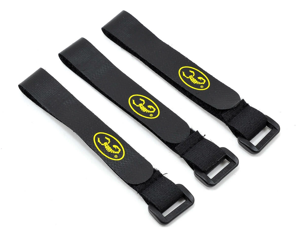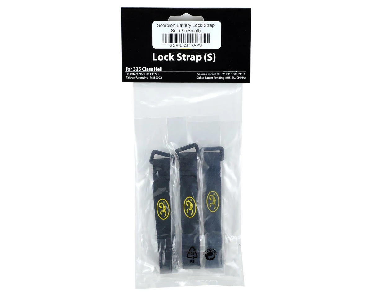 This is a pack of three Scorpion Small Battery Lock Straps. Using the latest design with a rubberized non-slip surface to provide maximum grip, this lock strap will hold the battery in 325 class helicopters securely, reducing the chances of the battery coming loose during flight.