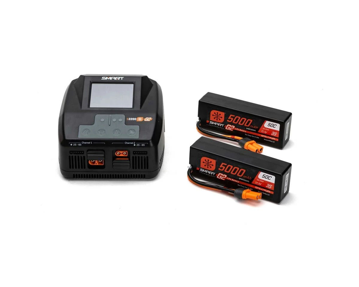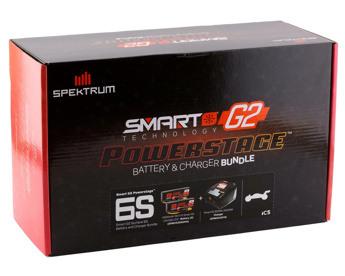 This is a Spektrum RC Smart G2 Powerstage 6s Bundle with two 3s Smart G2 LiPo Hard Case Batteries, bundled together with a powerful G2 S2200 charger, in an all in one-box solution for vehicles requiring 6s power.