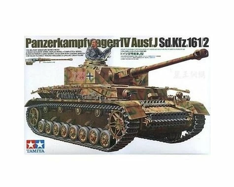 This is a Tamiya 1/35 German Panzer IV Tank Type J Model Kit. The Panzerkampfwagen IV was Germany’s most important tank during the second world war. It remained in mass production throughout the conflict, with more than 8,000 units being produced. This represented more than one-third of Germany’s total wartime tank production. It was the backbone of the Panzer Divisions and it was often referred to as their “Workhorse” The Pz.Kpfw. IV underwent constant improvement throughout its long career. As an example, its original short-barreled 7.5cm main gun was replaced with the long barreled 7.5cm KwK40 L/43 gun beginning with the Ausf.F2 version. The further improved 7.5cm KwK40 L/48 was added to the Ausf.H onwards. In 1944 however, with the introduction of the new Panther and Tiger tanks, plus other tactical considerations, the Pz.Kpfw. IV began to serve mainly in a defensive capacity. A need was required to simplify construction and increase productivity, plus conserve scarce raw materials. The last of the series, the Ausf.J thus had a much simpler construction, and an extra fuel tank replaced the auxiliary engine/generator. This greatly increased its range from 210km to 320km and was welcomed by the German troops, as they were having difficult with their supply, but it was attained at the expense of electric power for the turret traversing motor. The thin steel plates known as Schurzen (skirts), first introduced with the Ausf.G, were sometimes replaced with heavy gauge wire mesh, or not even used at all.