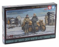 The Tamiya German Luftwaffe Crew 1/48 Model Kit was originally created by the Ukrainian kit maker ICM. This version takes the standard kit and powers it up by adding Tamiya accessories and instructions. The kit itself recreates crew from the Luftwaffe, the famed WWII German air arm which of course included not only pilots but also a whole range of recruits in supporting roles. They served in some harsh winter climates, necessitating warm clothes such as pilots’ jackets with fur collar (often the pilot’s own), and thick sheepskin overcoats for those on sentry duty. The Kettenkraftrad 3-meter half-track was something like a hybrid motorcycle with a single front wheel and used its 1.5-liter engine to tow aircraft, carry bombs and more.