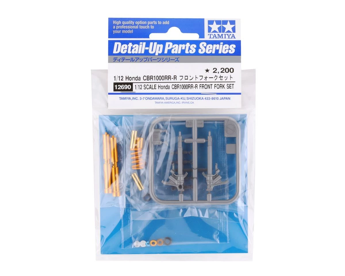 The Tamiya Honda CBR1000RR-R 1/12 Scale Front Fork Set is a great way to add further realism to the Tamiya CBR1000RR0r (TAM14138). Made from metal and plastic this optional set will help provide a realistic finish. Package include one scale fork set.