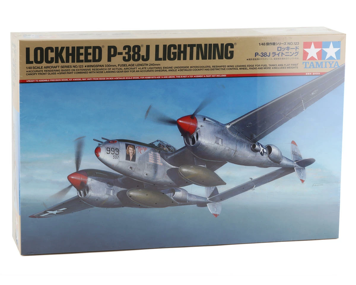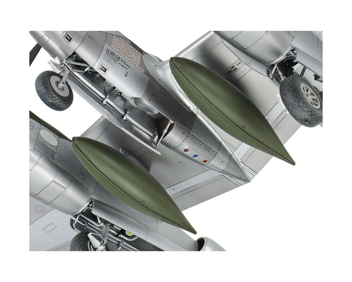 The Tamiya Lockheed P-38 J Lightning 1/48 Model Airplane Kit has been designed to bring yet another legendary aircraft to the Tamiya 1/48 scale model lineup. The full-sized Lockheed P-38 Lightning made its first flight in January of 1939 with the P-38 J variant taking flight in 1943. The J version featured streamlined engine nacelles that fitted the turbo-supercharger intercooler system as well as the oil cooler for increased protection during combat. Powered by two Allison V-1710-81 or V1710-91, each producing over 1400hp, this plane was capable of speeds over 400mph and had a combat range of 1300 miles. Tamiya has brought extreme attention to detail in this 1/48 scale P-38 J Lighting model.
