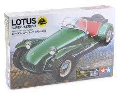 Tamiya Lotus Super 7 Series II 1/24 Model Car Kit. The Super 7 is an iconic kit car that was released in 1957. Tamiya has recreated many of the details including the exposed front suspension, side exit exhaust, realistic Ford Cosworth four-cylinder 1.3L engine and detailed race harnesses. Package includes one Lotus Super 7 model kit.