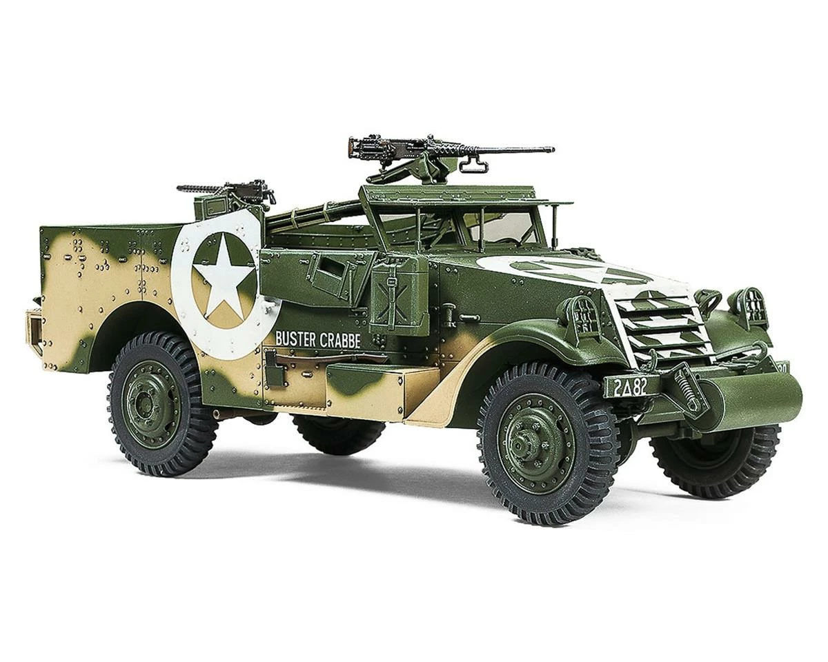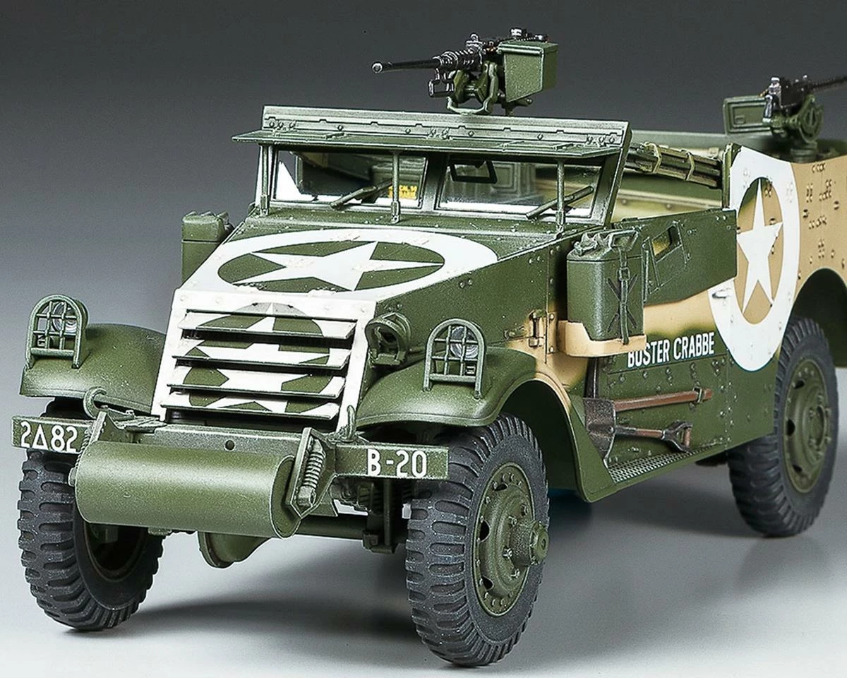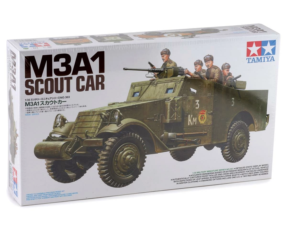 The Tamiya M3A1 Scout Car 1/35 Model Kit is a scale model replica of the M3A1 Scout Car. It promises to be a great stand-alone model or make for an essential diorama piece in a bigger modeling project. Around 21,000 of the actual car were built, a vital cog in the setup of U.S. forces and those Allies (Britain, Soviet Union, Free France, China and more) who received it under “lend-lease.” Lightly protected with mainly 6.4mm armor, with a top road speed of 80km/h, it had one 12.7mm and two 7.62mm machine guns, could seat six in addition to a driver and commander, and was often deployed in recon and command car roles, in North Africa, Sicily, and on the Eastern Front.