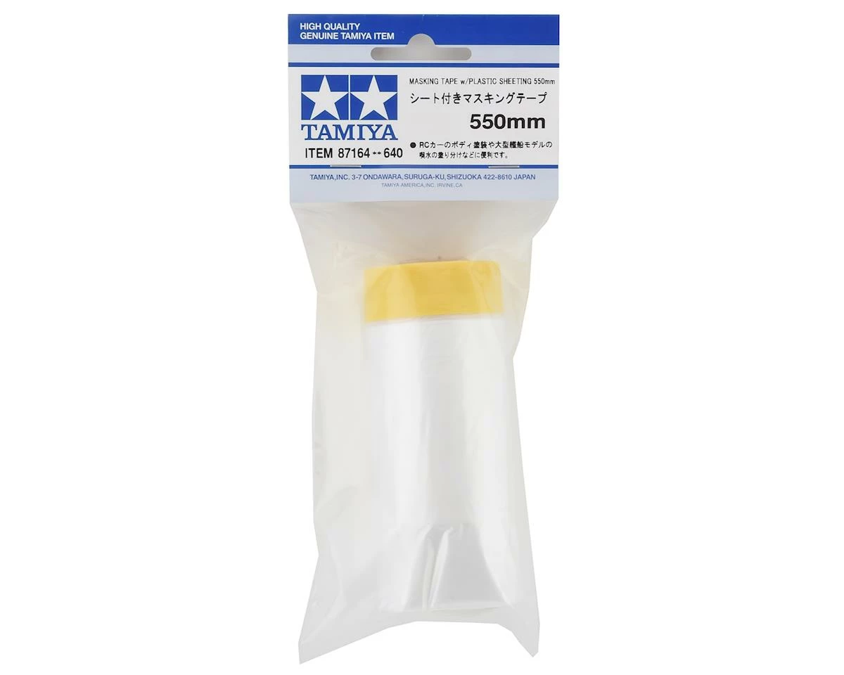 This Tamiya is a Masking Tape/Plastic Sheeting is a highly popular masking tape and a handy way to mask off larger areas in the painting process, for example R/C car bodies. The masking tape comes pre-attached to plastic sheeting, and when folded out it has a width of 550mm. This masking tape attaches securely to the surface to be covered, protecting it from unwanted paint and giving sharply defined edges. It peels off easily once the object has been painted.