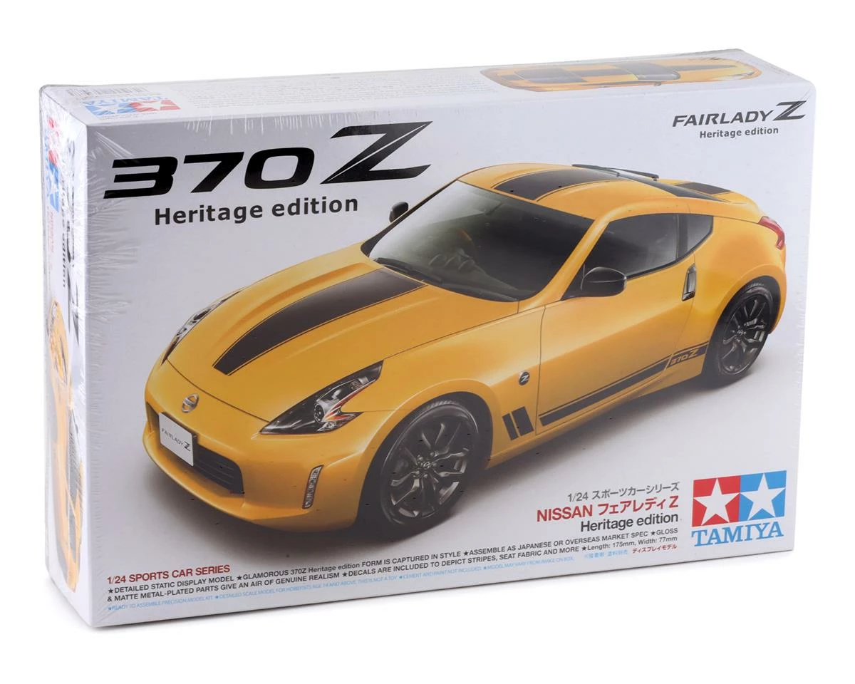 Tamiya 1/24 Nissan 370Z Heritage Edition kit. Truly iconic car names are few and far between, but one must surely apply that moniker to the “Z-Car”, sold in Japan as the Fairlady Z. From its debut as the 240Z (S30) in 1969 through to the present day, it has delighted sports car fans across the world. The current 370Z design has been tweaked and updated since its first release in 2008, and in May 2018 a special Heritage edition was released with racing stripes and an interior design inspired by the special “Zap” edition of the classic 280Z. Tamiya has faithfully reproduced this heritage edition Z in 1/24 scale with all the detailed edition parts faithfully depicted.