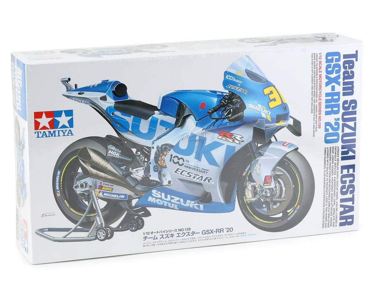 The Tamiya Team Suzuki ECSTAR GSX-RR ’20 1/12 Model Motorcycle Kit has been designed to recreate the looks of the full sized motorcycle. With the name of Suzuki’s hi-spec engine oil brand, ECSTAR, this bike featured a blue and silver scheme inspired by 1960s GP models, and was ridden by Joan Mir and Alex Rins. Tamiya faithfully recreated the looks of this model down into 1/12 scale. Package includes one model kit.