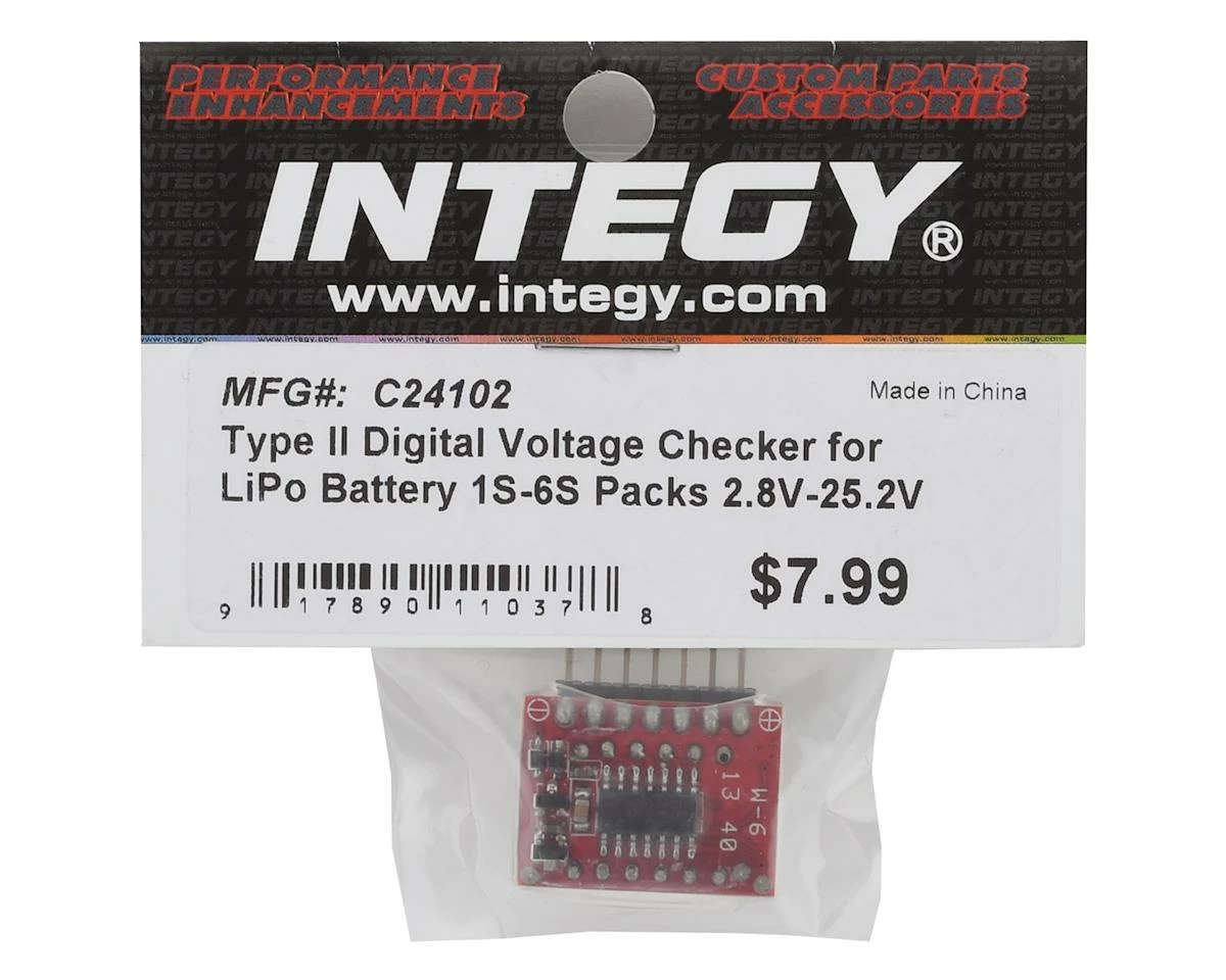 This is the Team Integy Type II Digital Voltage Checker for LiPo Batteries ranging from 1S to 6S, or 2.8V to 25.2V.Â