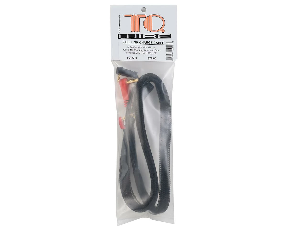 The TQ Wire Strain Relief 2S Charge Cable has the same features found in the standard TQ Wire 2S cable like 12 gauge wires wrapped in black nylon mesh; stepped bullets so you can charge both 4mm and 5mm batteries and XH connector on the charger side.