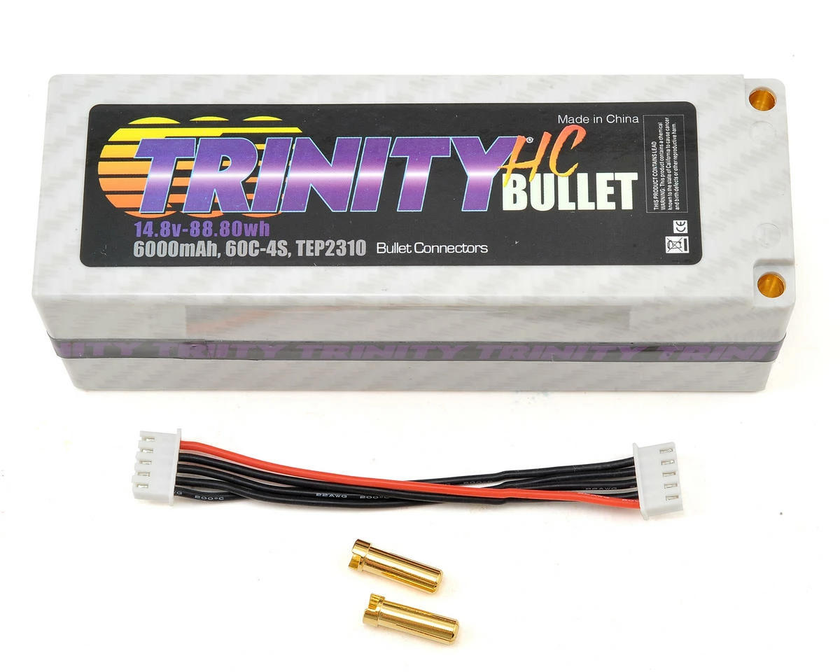 This is the Trinity Hi-Capacity 14.8V 4S 60C LiPo Hardcase Battery Pack with 5mm Bullet Connectors and 6000mAh capacity. This pack features an improved balance design with an incorporated balance port for a “no exposed wires” clean look. When charging, simply plug in the included balance jumper to the battery, and the other end to your balance board.