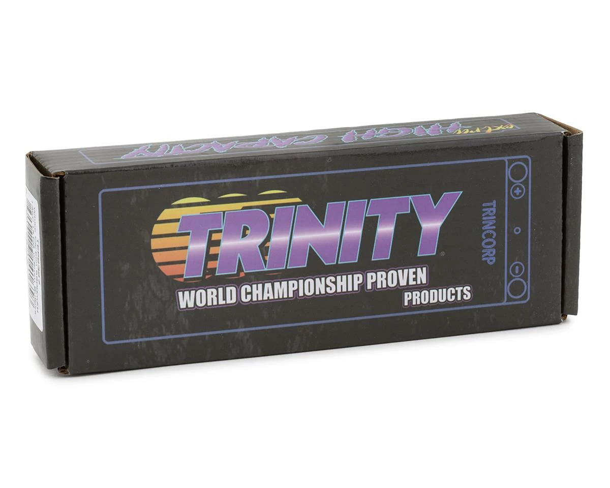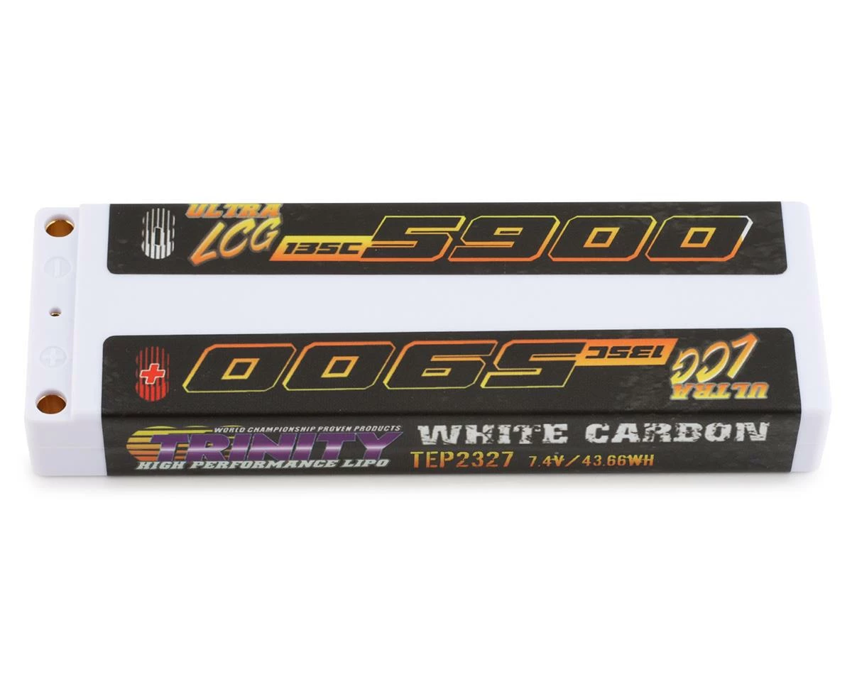 This is the Trinity ULCG 2S 100C Hardcase LiPo Battery with 5mm Bullet Connectors and a 5900mah capacity. This battery features an Ultra Low Center of Gravity (ULCG) design providing a handling increase over traditional stick packs. Using high quality materials during construction Trinity batteries provide the high performance racers are looking for. This battery is also VTA approved making it an excellent choice for a Low Center of Gravity battery option.Â